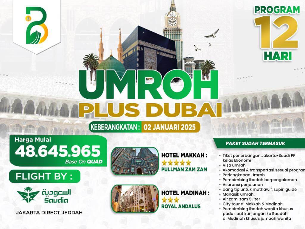 - Perlengkapan : Koper kabin, koper bagasi, tas paspor, kain ihram/mukena, sandal, buku manasik, kain seragam, syal, & sabuk